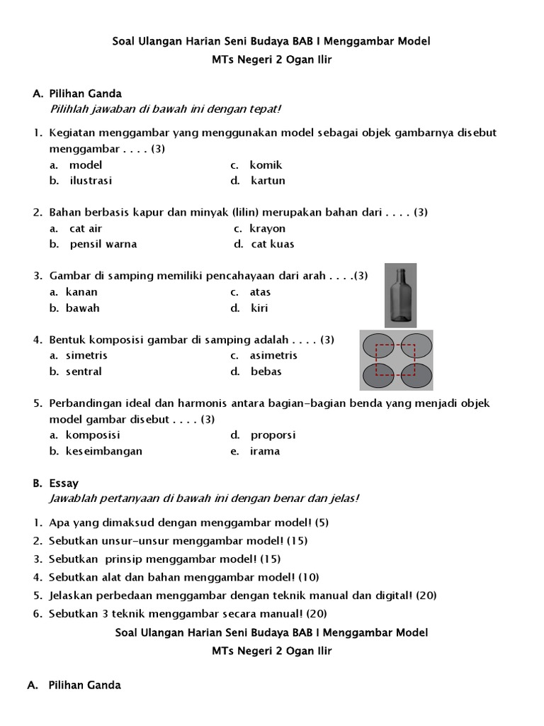 Soal latihan atau soal evaluasi seni budaya kelas 8 yang akan saya bagikan disini ialah terdiri dari soal dalam bentuk pilihan ganda dan juga soal dalam sedangkan bagi anda yang membutuhkan soal latihan seni budaya kelas 8 semester 1 yang juga sudah lengkap dengan kunci jawaban dan. Pokok pikiran kemanusian yang adil dan beradab mengandung pengertian. Berikut ini adalah rincian soal uts seni budaya kelas 8 smp/mts semester 1. Sure where is the conversation take posting pada contoh soalditag # contoh soal bahasa inggris, #contoh soal bahasa inggris esay, #contoh soal bahasa inggris pilihan ganda. Kami bagikan soal ipa kelas 8 dan kunci jawabannya untuk latihan ulangan ukk, uts, harian pilihan ganda dan essay tahun pelajaran 2017/2018.